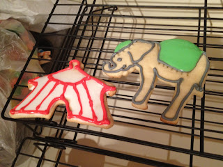I went over to my friend Megan's house this week to help her make cookies for a circus themed brunch. She bought adorable cookie cutters from Fancy Flours. The elephant cookie cutters worked the best so we decided to just use those and the circus tent.