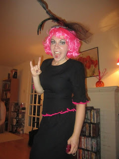 The hat I bought at Cracker Barrel during Halloween last year and the wig I bought online (It's a Frenchie wig from Grease.) The dress was just a God-send. I went to Goodwill and was looking for 80's prom dresses (big puffed sleeves!), but they had none. Luckily this beauty caught my eye! The pink lining was perfect and while it didn't have puffed sleeves, it did have some pretty sweet shoulder pads.