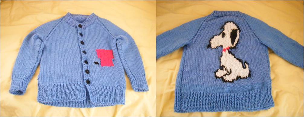 My Aunt Robin gave me the pattern for this easy to make baby sweater. I've made it twice - one for a boy and one for a girl. The first time I just bought normal black buttons. Then I found adorable dog bone buttons and knew I had to make it again!