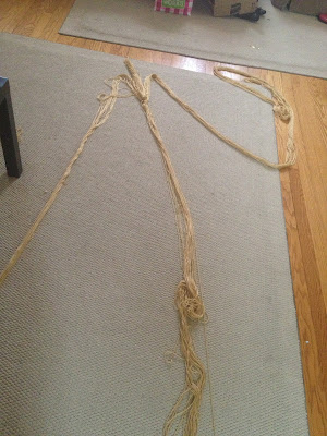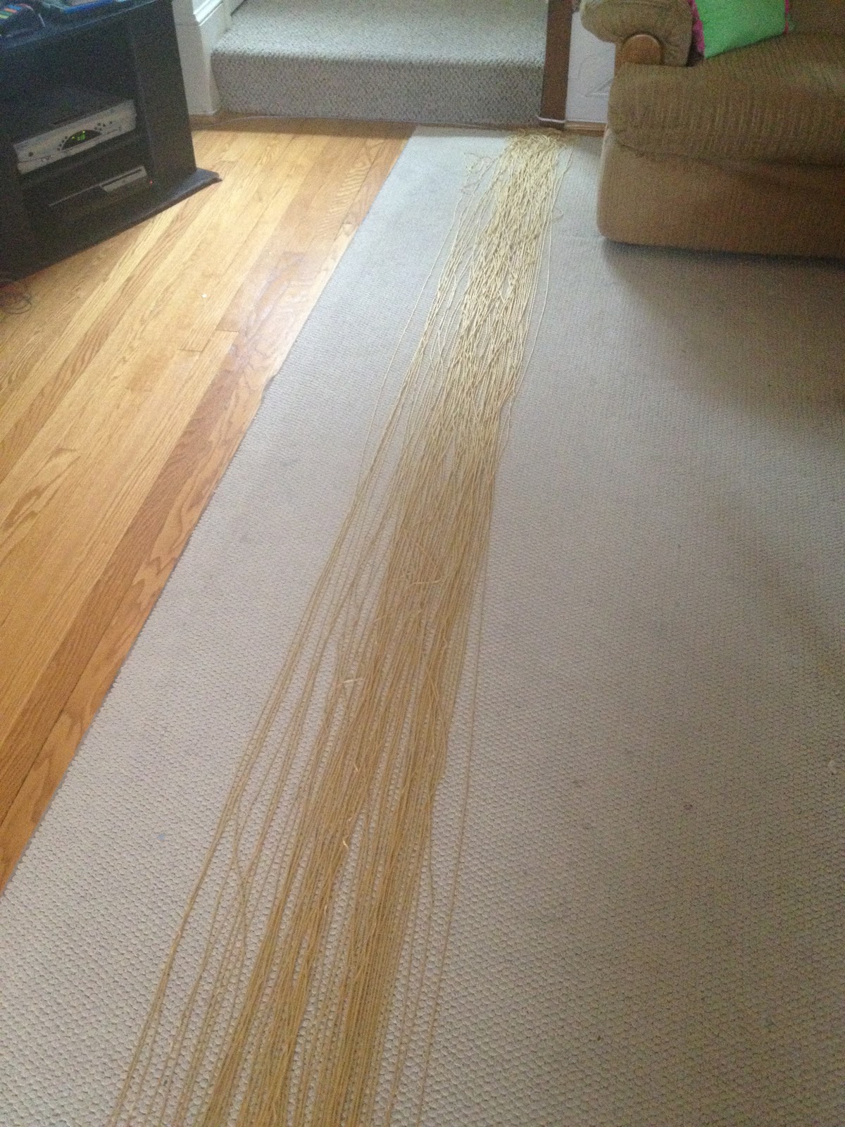 So Rapunzel. That girl must have some mad brushing skillz. I bought gold colored yarn to make a really long braid. I spread it out on my living room floor then divided it into 3 sections.
