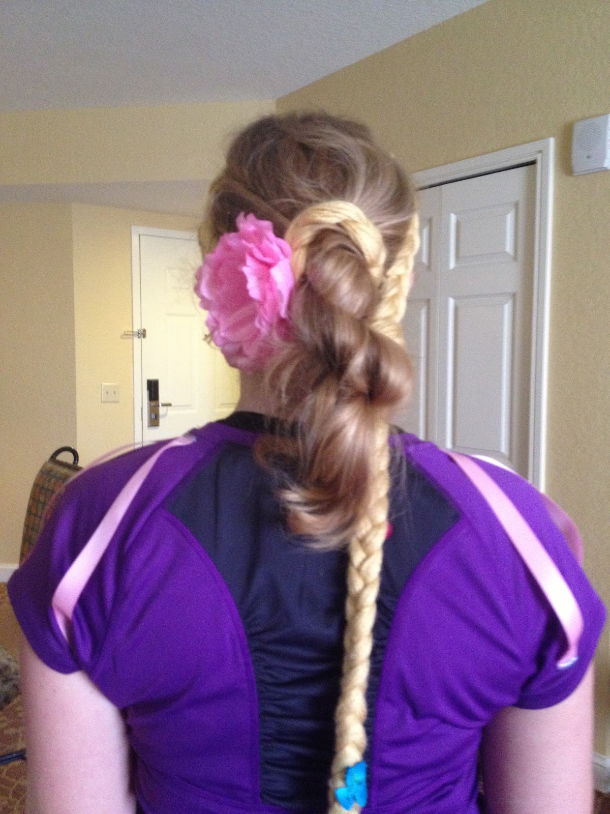 It took me forever to braid it because of the constant tangling and having to move 1 strand at a time. I really needed a hoard of little girls to do it like she had in the movie. (If you're going to attempt this I recommend you bribe some friends to help.) I finally got it done and then used my trusty hot-glue gun to attach some flowers I bought at Michael's.