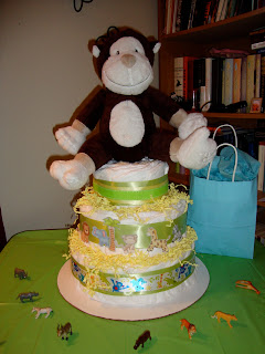 Happy Spring!! This is another item from Kim's baby shower - a jungle themed diaper cake! I used bottles for the core and used a rubber band to hold rolled newborn diapers to the bottle. It's like a bonus present inside a ton of diapers!