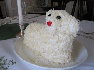 Grandma also dyed coconut green to be the grass the lamb was lying on … we didn’t go that far, but we did make him nice and fluffy. First, my mom made the cake, using a Duncan Hines white cake mix. It was really good - she made mini-lambs with smaller molds using the extra batter, and we sampled it the day before. It tasted like angel food cake but not as insubstantial. Then my dad made some “Seven Minute White Icing” from The Joy of Cooking, and iced the lamb. Finally, I took over with the coconut. It was not easy to secure coconut onto all the vertical surfaces of this cake. I found I had more success when I focused and had the courage of my convictions.