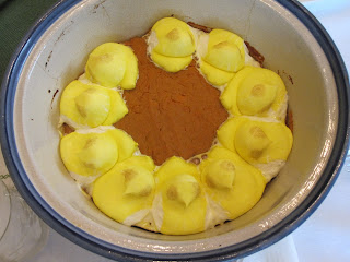 We picked up the yams (they’re interchangeable, right?) and Peeps on the way back from church that day, so it’s possible we were not availed of the most complete smorgasbord of Peep options possible. A Safeway employee had to help me find the only Peeps left, and it looked like the only options available were small pink chicks or small yellow chicks, so I took two packages of the yellow ones. They were not big enough to make a nice complete ring like the website’s picture - so I spaced them out evenly when I put the casserole back in the oven to roast them. They got bigger, but they really got bigger when we put them in right before dinner to warm up. They kind of melded together at that point into an almost full ring, and while that may not be the ideal way to do it, it meant more Peepy goodness for our guests to enjoy.