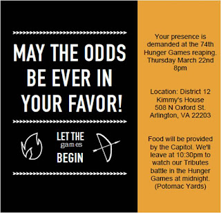 Today I planned out the menu for my Hunger Games party - OMG - 3 DAYS!!!!!!!!!!! I'm going to make 3 recipes from the Unofficial Hunger Games Cookbook and attempt a fondant cake. I also made these invitations: